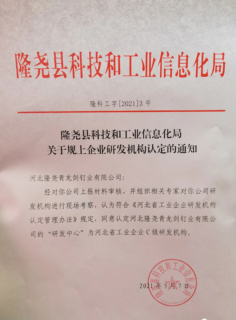 經對你公司上報材料審核, 并組織相關專家對你公司研發機構進行現場考察, 認為符合 《河北省工業企業研發機構認定管理辦法》規定,同意認定河北隆堯青龍劍釘業有限公司的 "研發中心" 為河北省工業企業C 級研發機構。